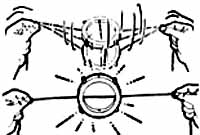 Le magicien explique qu'il s'est procuré quelques « fibres » de la fameuse toison d'or. Les deux ficelles sont enfilées à travers un anneau. Ensuite, avec des ciseaux, le magicien coupe le centre d'une ficelle et les extrémités de l'autre. Le centre de l'anneau pivote de manière à faire coïncider les deux morceaux séparés et magiquement, ils se joignent en une seule ficelle. |